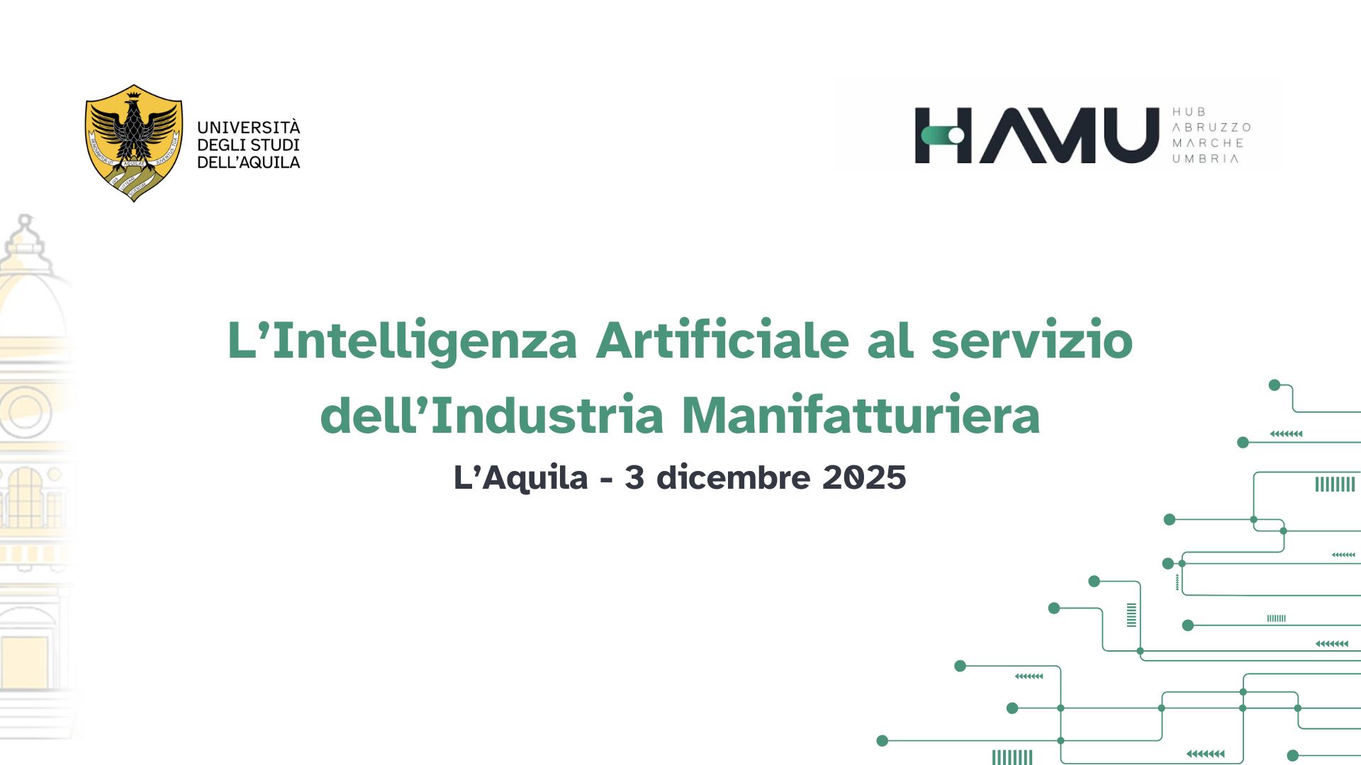L’Università degli Studi dell’Aquila e HAMU organizzano l’evento “L’Intelligenza Artificiale al servizio dell’Industria Manifatturiera” dedicato all’impatto dell’AI nei processi produttivi. Il 3 dicembre 2025, nel Centro Congressi “Luigi Zordan”, si terrà il pomeriggio di confronto tra accademia, imprese e centri di innovazione.