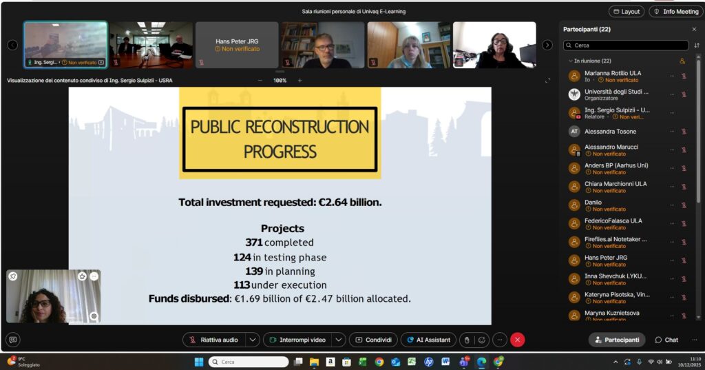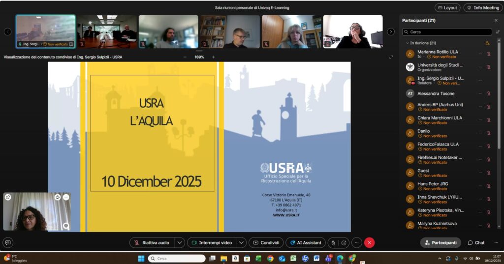 Nell’ambito della stessa collaborazione funzionale alla condivisione di competenze, lo scorso 27 novembre si era svolto anche il workshop tematico “The Urban Regeneration of Smaller Towns in Abruzzo After Disaster: Focusing on Underground Services”, organizzato in collaborazione con l’Ufficio Speciale per la Ricostruzione dei Comuni del Cratere (USRC), con la partecipazione del suo titolare, Ing. Raffaello Fico.