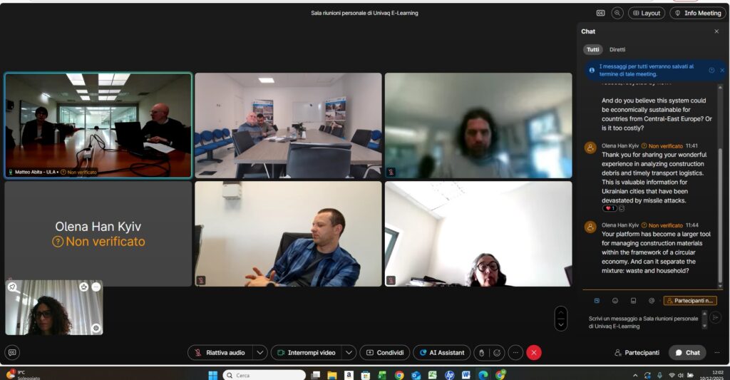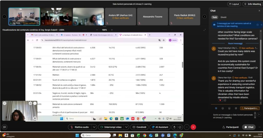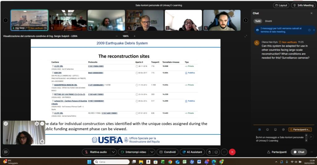 Il rappresentante USRA, Ing. Sergio Sulpizii, supportato dal collega Arch. Andrea Calzetta, ha presentato le attività dell’Ufficio Speciale, ha introdotto gli aspetti fondamentali relativi al quadro normativo di settore e ha illustrato il funzionamento del sistema “macerie sisma 2009”, uno strumento fondamentale di controllo e trasparenza, insieme al relativo portale open data (https://www.maceriesisma2009.it/).