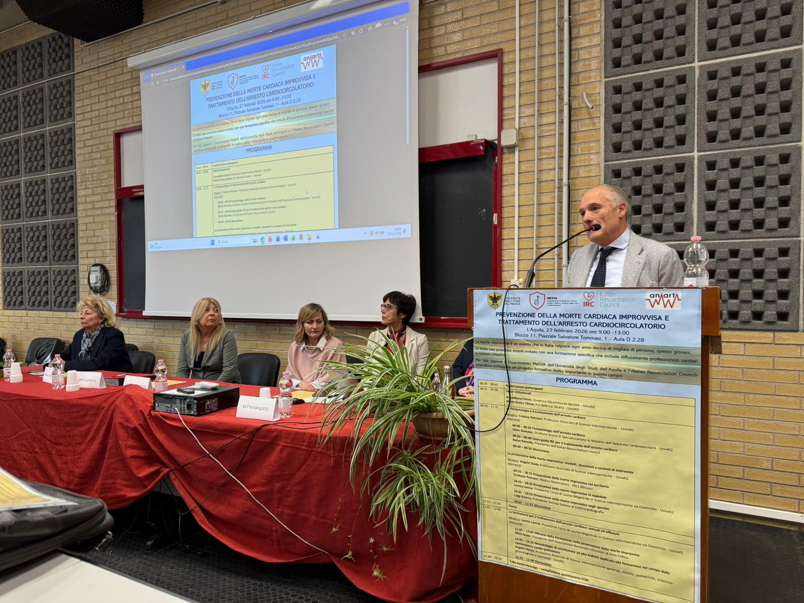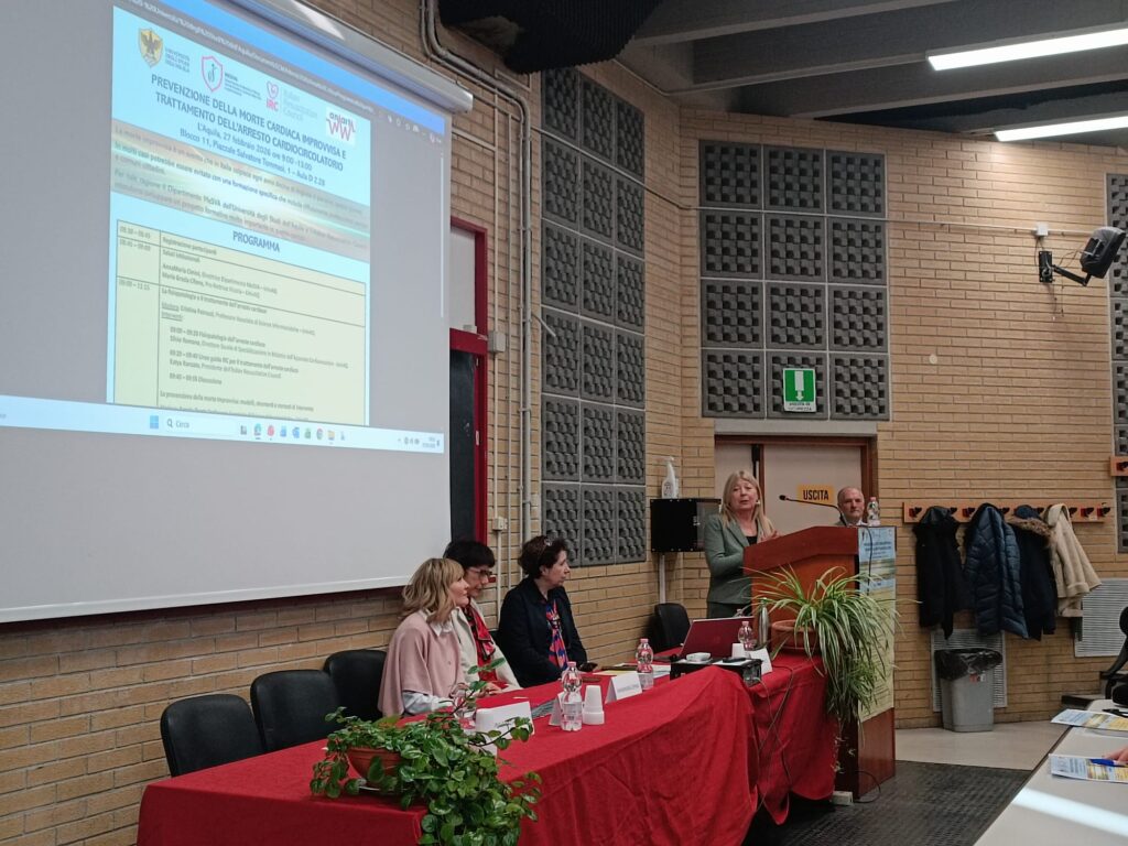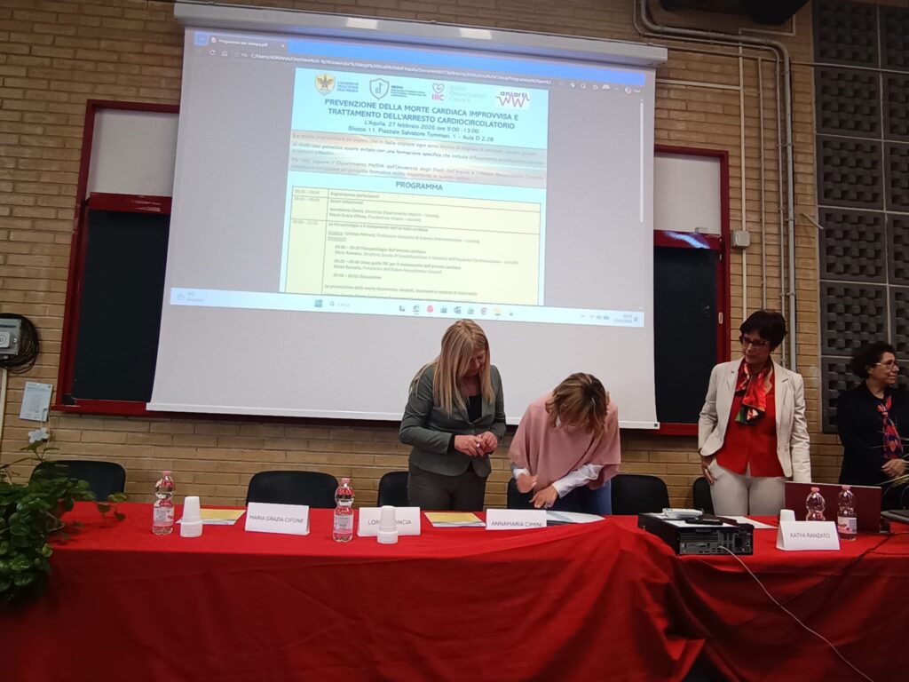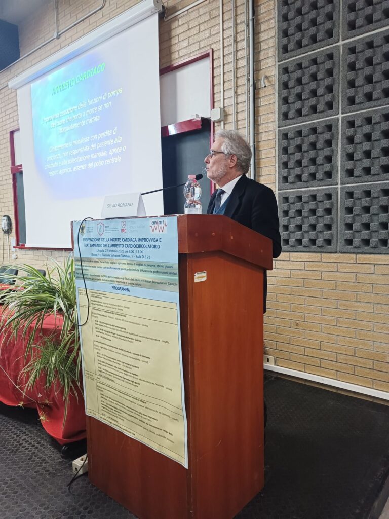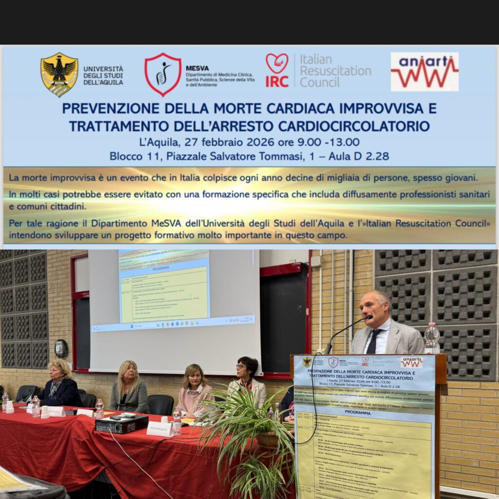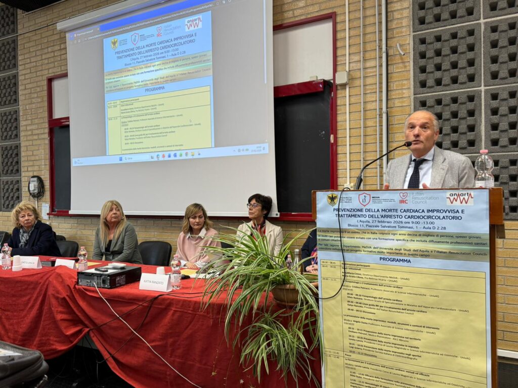 Su questi temi si è soffermato l’incontro formativo “Prevenzione della morte cardiaca improvvisa e trattamento dell’arresto cardiocircolatorio”, che si è svolto venerdì 27 febbraio 2026 presso l’Aula D2.28 nell’Edificio Edificio Paride Stefanini, piazzale Salvatore Tommasi 1, Coppito (L’Aquila), organizzato dal Dipartimento di Medicina Clinica, Sanità Pubblica, Scienze della Vita e dell’Ambiente (MeSVA) nell’ambito delle attività di Formazione Continua in Medicina erogate dal provider ECM dell’Università degli Studi dell’Aquila.