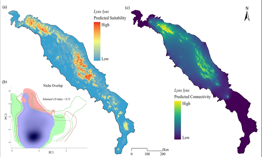Il primo passo della ricerca è stato confrontare le condizioni ambientali degli Appennini con quelle delle possibili popolazioni sorgente, cioè dalle quali prelevare gli individui potenzialmente più idonei per una reintroduzione. L’analisi della nicchia ecologica ha mostrato una forte somiglianza tra gli ambienti appenninici e quelli occupati dalle linci nei Carpazi. Questo risultato suggerisce che queste popolazioni potrebbero rappresentare la miglior fonte per eventuali programmi di reintroduzione. Successivamente, utilizzando modelli di distribuzione delle specie sono state individuate le aree più idonee alla presenza della lince negli Appennini. Questi modelli, basati su dati ambientali come copertura forestale, topografia e presenza umana, permettono di stimare dove l’habitat è più favorevole (in figura). Tuttavia, individuare un habitat adatto non è sufficiente: gli animali devono anche potersi muovere nel paesaggio. Per questo motivo lo studio ha integrato i modelli di idoneità con analisi di connettività basate sulla teoria dei circuiti, una tecnica che permette di identificare possibili corridoi ecologici di collegamento.
