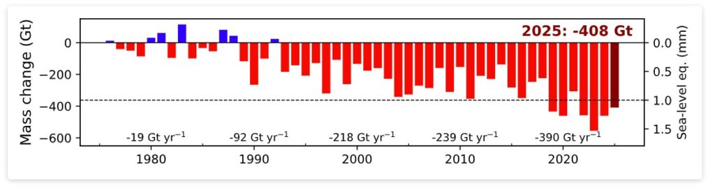 Didascalia grafico: Variazione globale della massa glaciale nel periodo 1976–2025. Le barre colorate indicano gli anni con variazioni di massa annuali positive (blu) e negative (rosso) e mettono in evidenza i risultati del 2025 (rosso scuro). I tassi decennali di variazione della massa (Gt/anno) sono indicati sopra l’asse delle ascisse. La linea nera tratteggiata indica una variazione di massa (circa 362 Gt) equivalente a 1 mm di innalzamento del livello del mare. Fonte: The WGMS Network (2026), Nature Reviews Earth & Environment. https://doi.org/10.1038/s43017-026-00777-z